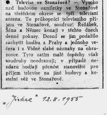 Výstřižek z regionálních novin o těžkých začátcích televizního příjmu v obci(12.8.1955)
