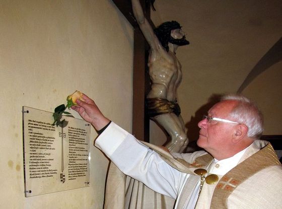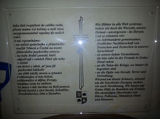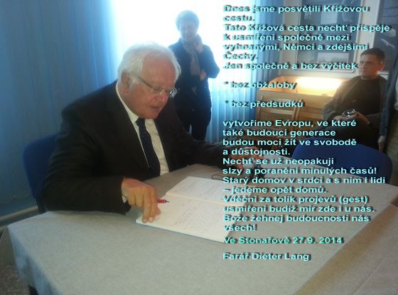 Dne 1. 6. 2013 si splnil pan Dieter Lang svůj sen - umístění cedule o usmíření našich národů do kostela ve Stonařově